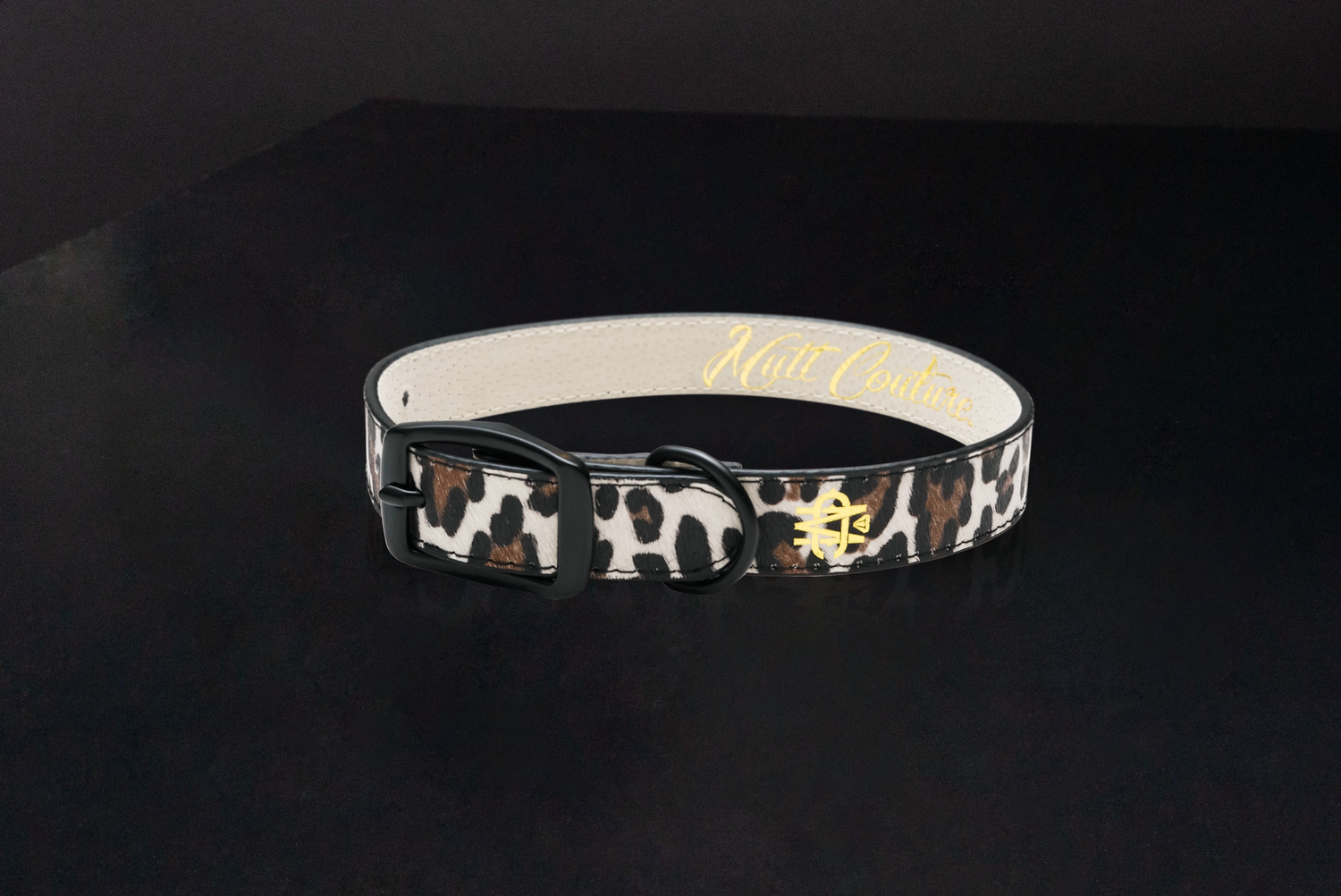 This leopard print leather dog collar is crafted with genuine leather. Features faux leopard print and custom texturing for a realistic look and feel. Constructed with supple leather and durable black metal hardware.