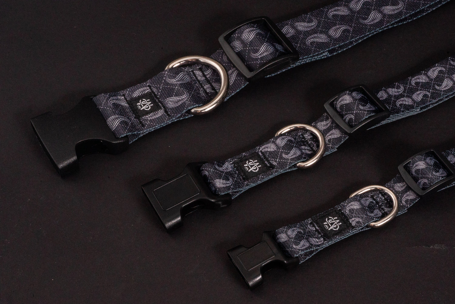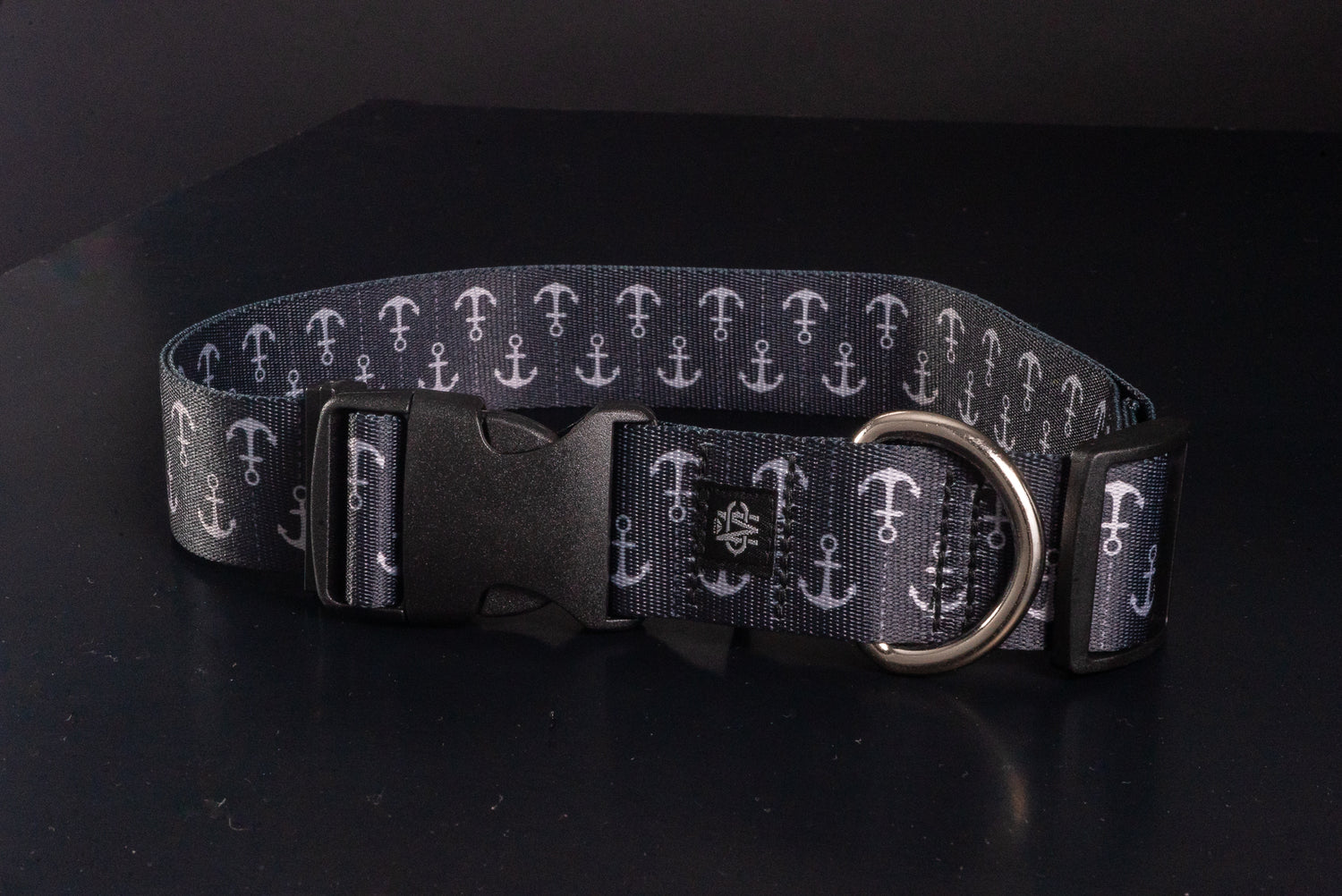 Black adjustable sailor anchor print designer dog collar is constructed with thick, durable nylon straps, chrome hardware, and robust plastic buckles.