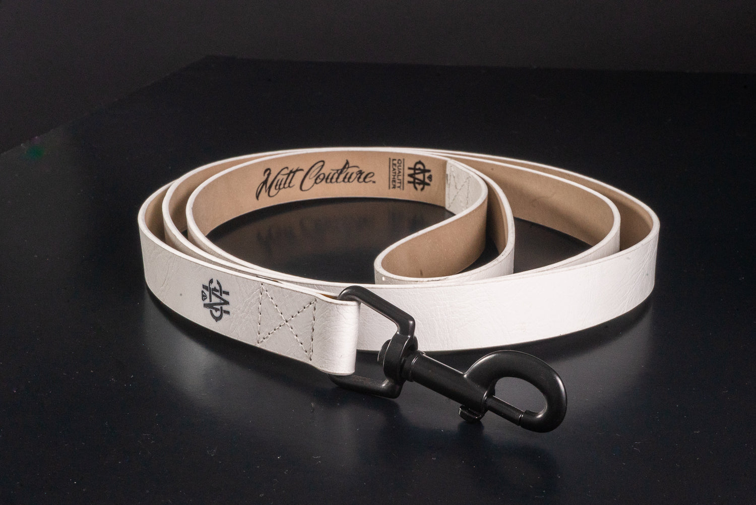 This white leather dog leash is constructed with durable genuine leather and black finished metal hardware to match any of our dog collars with black hardware, like the white patent leather dog collar. Style this leash with a crisp white shirt or spotless white boots.